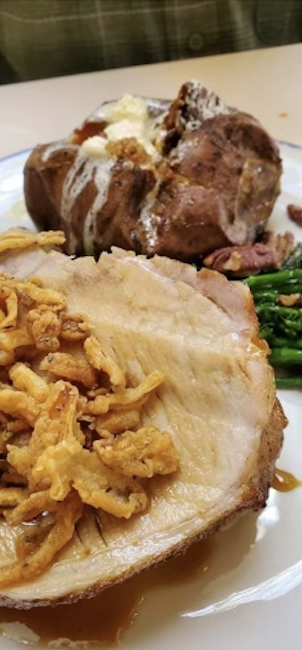 Kyle had the bone-in pork chop ripped with crispy onions and spiced apple reduction, with baked sweet potato, and my asparagus. His pork chop was very large, overcooked, and dry, but a new one was brought when requested. The second was thinner and cooked perfectly. The apple reduction was perfect for the pork.