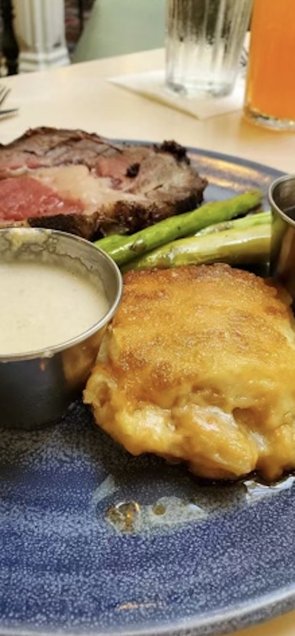 For our meals, I had the prime rib with au jus and horseradish cream, au gratin potatoes, and asparagus. The prime rib was seasoned and cooked perfectly, the potatoes were cheesy, and I traded my asparagus for Kyles broccolini.